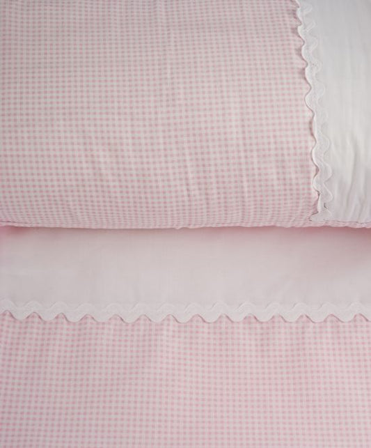 Pack funda nórdica y set sábanas para bebé en diseño vichy rosa y puntillas en blanco para cuna de 60 y algodón de primera calidad